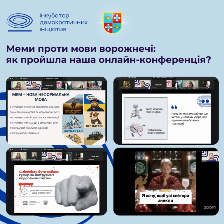 ГО «Інкубатор демократичних ініціатив» запрошує на онлайн-конференцію «Меми проти мови ворожнечі: нові стратегії для молоді». Учасники та учасниці проєкту «Арсенал мемів проти мови ворожнечі» представлять [...]