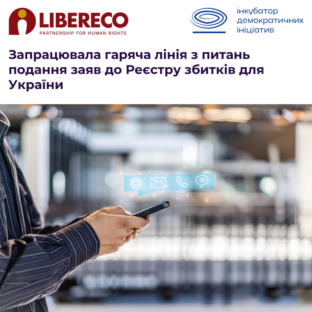 Проєкт «Доступ до правосуддя та гідності: гуманітарна підтримка постраждалих від війни у поданні заяв про компенсацію» реалізується ГО «Інкубатор демократичних ініціатив» за підтримки LIBERECO – Partnership for Human Rights (Швейцарія).